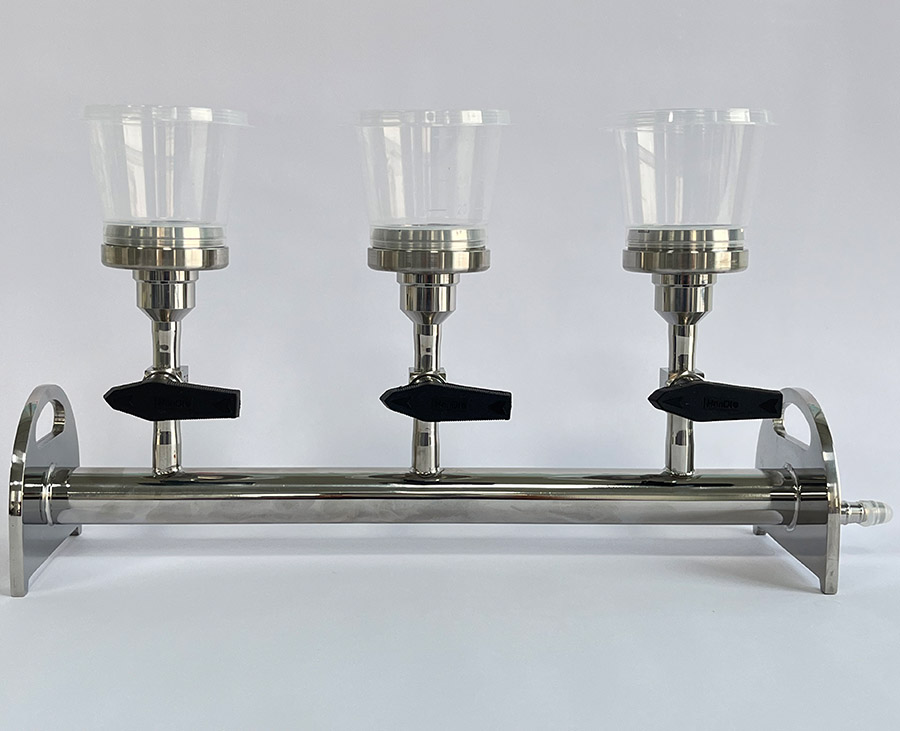 4、可同时抽滤三张滤膜,大大提高了工作效率,凹槽设计的滤头边缘,让放膜取膜变的安全简单;
